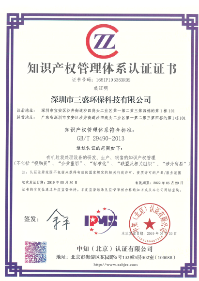 近日,深圳市三盛環(huán)保科技有限公司順利通過(guò)了《企業(yè)知識(shí)產(chǎn)權(quán)管理規(guī)范》國(guó)家標(biāo)準(zhǔn)審核認(rèn)證,并收到由中知(北京)認(rèn)證有限公司頒發(fā)的《知識(shí)產(chǎn)權(quán)管理體系認(rèn)證證書》。在知識(shí)產(chǎn)權(quán)領(lǐng)域獲得新的認(rèn)可,在知識(shí)產(chǎn)權(quán)方面得到進(jìn)一步規(guī)范、有助于企業(yè)科學(xué)發(fā)展、提升企業(yè)科技含量,在綜合競(jìng)爭(zhēng)力方面得到進(jìn)一步提升!